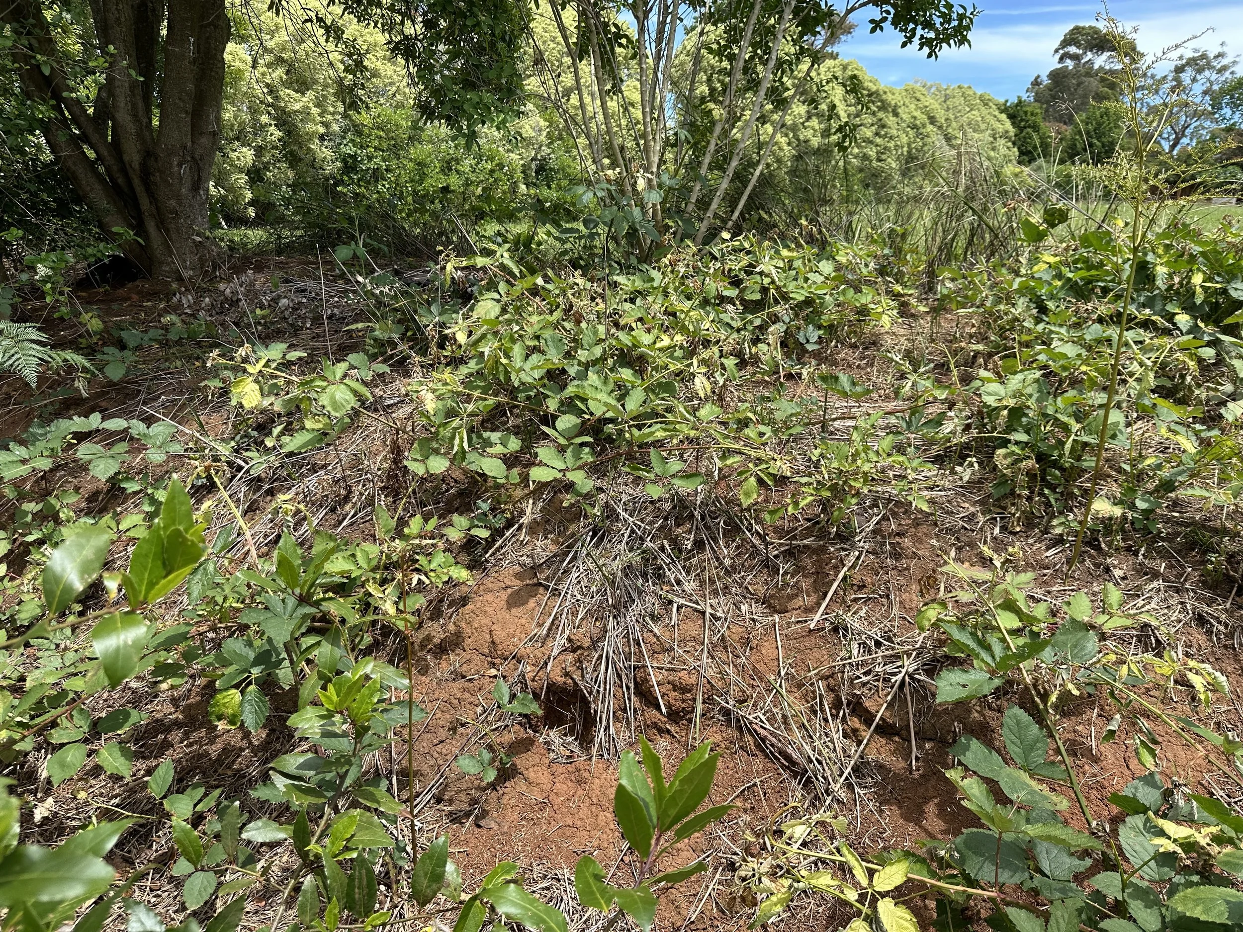 As blackberries re-shoot it is important to re-treat an area so they don’t get large and unmanageable again. This area was excavated last year, and the regrowth has been sprayed whilst small. It’s still too early to revegetate this area with desirable plants. It will require more management. Better timing of herbicide and better application techniques may possibly have improved the level of control here, but often weather limits the best results.