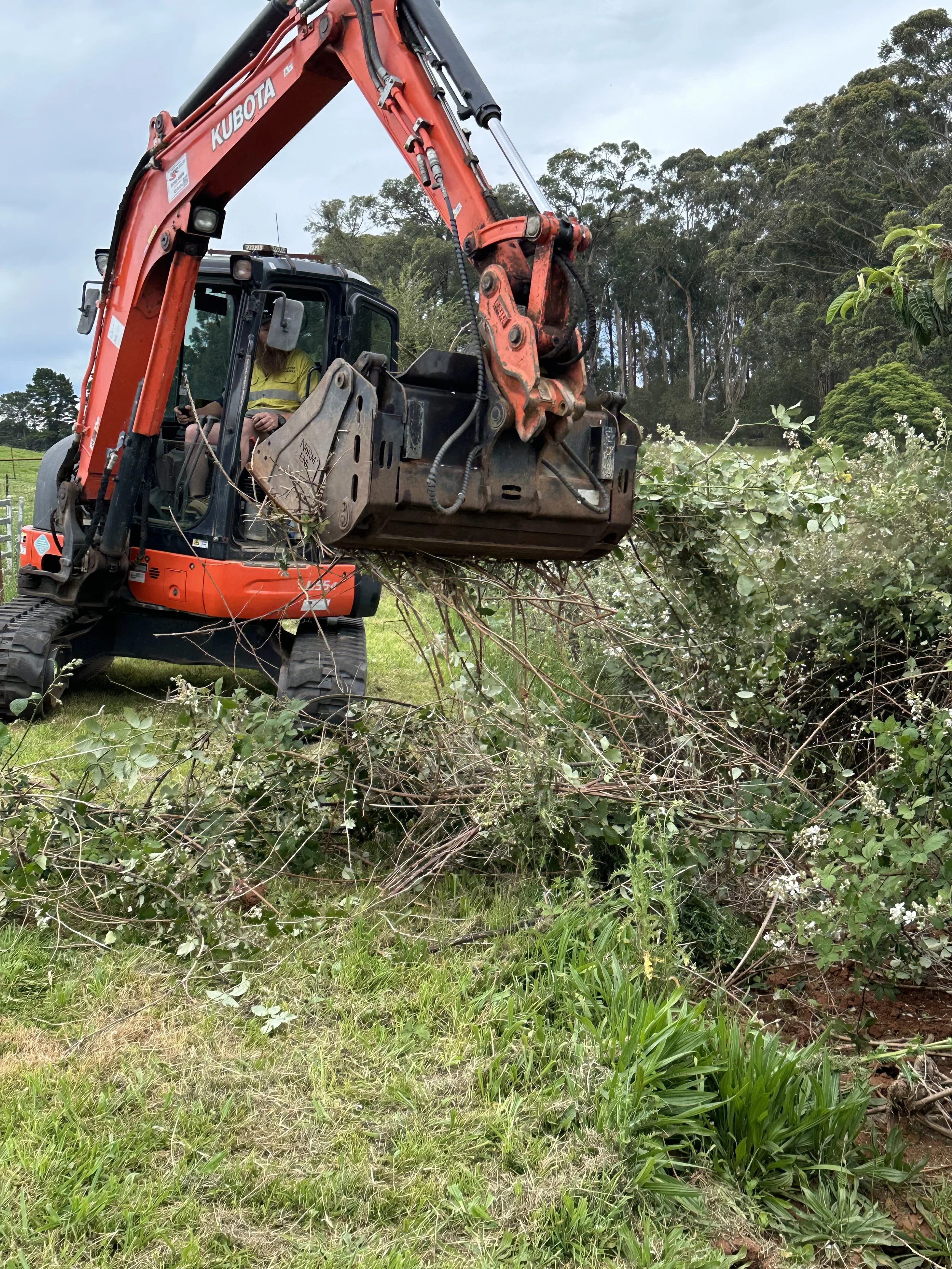 An excavator with a claw was used on this hilly embankment. The claw was able to push through the prickly canes and grab each plant at the base, removing the crown and most of the roots. Crowns and canes were collected in a pile for the goats to eat (alternatively mulched or burned). The bare embankment was sown with grass seed to stabilise the soil. Blackberry regrowth will be spot sprayed in year 2 and resown in year 3.