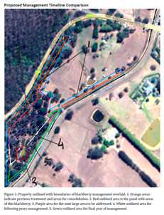 The new owners didn’t know where to start managing the overgrown blackberries! Property mapping showed the blackberry infestation areas, topography, native plants and natural water courses. Action areas were prioritised for the property owner to tackle as they can afford the time and investment (likely 3 years). Planning also considered a range of recommended techniques for each area and time in each subsequent year to regularly maintain treated areas, so the blackberries don’t take over again.